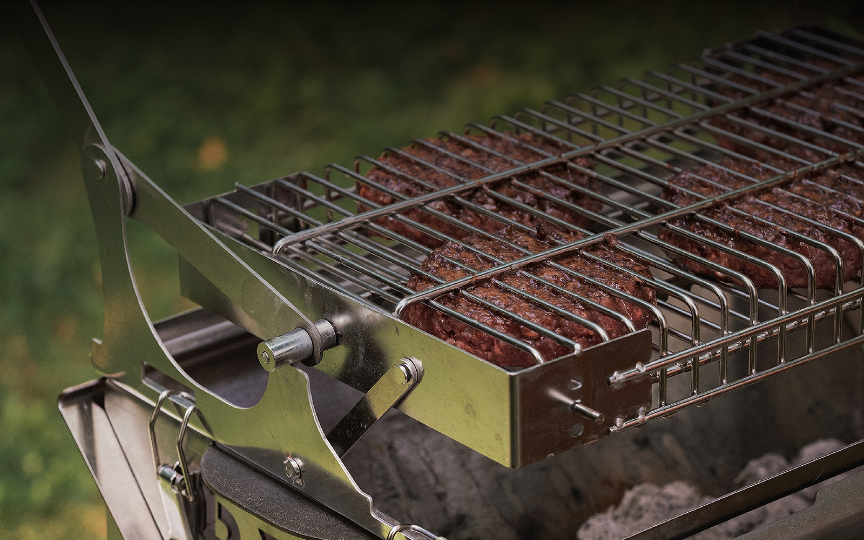 A portable, stainless-steel, food-grade charcoal grill with the world’s first FLIP THE GRILL, NOT THE MEAT design. Built tough, compact, and ready for backyard warriors, campers, and adventurers who demand real fire flavor anywhere.